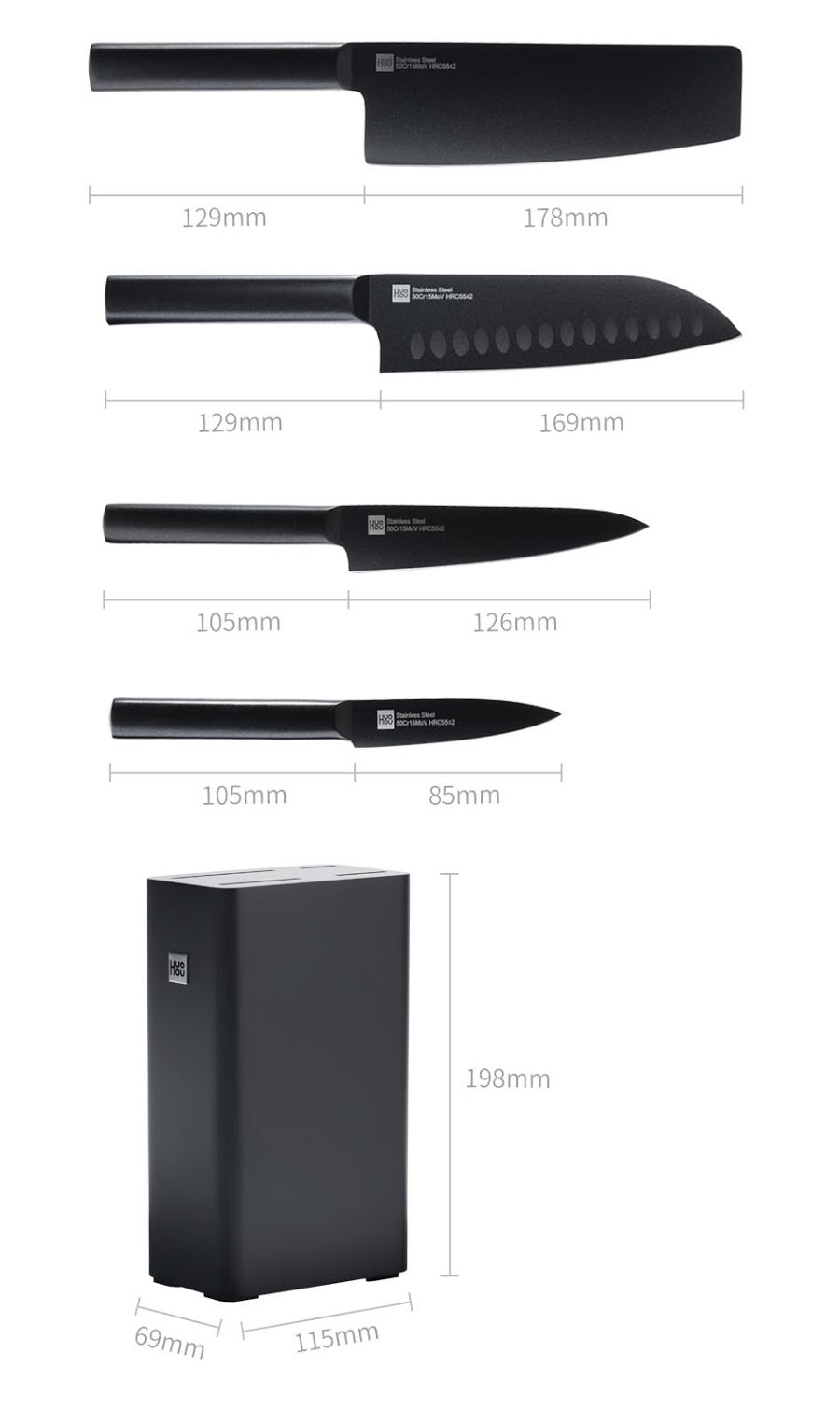 Dao băm có phần lưỡi tương đối lớn với chiều dài 178 mm cùng với phần tay cầm 129 mm tạo cho giúp người dùng có đủ lực để băm thịt. Dao đầu bếp được thiết kế với phần mũi dao nhọn và chiều dài dao là 169 mm, dao đa năng có chiều dài phần lưỡi là 126 mm, mũi dao nhọn có thể giúp người dùng sử dụng trong nhiều trường hợp khác nhau. Còn lại dao cắt trái cây với kích thước nhẹ chỉ 80 g giúp người dùng có thể dễ dàng cắt trái cây mà không bị mỏi tay.