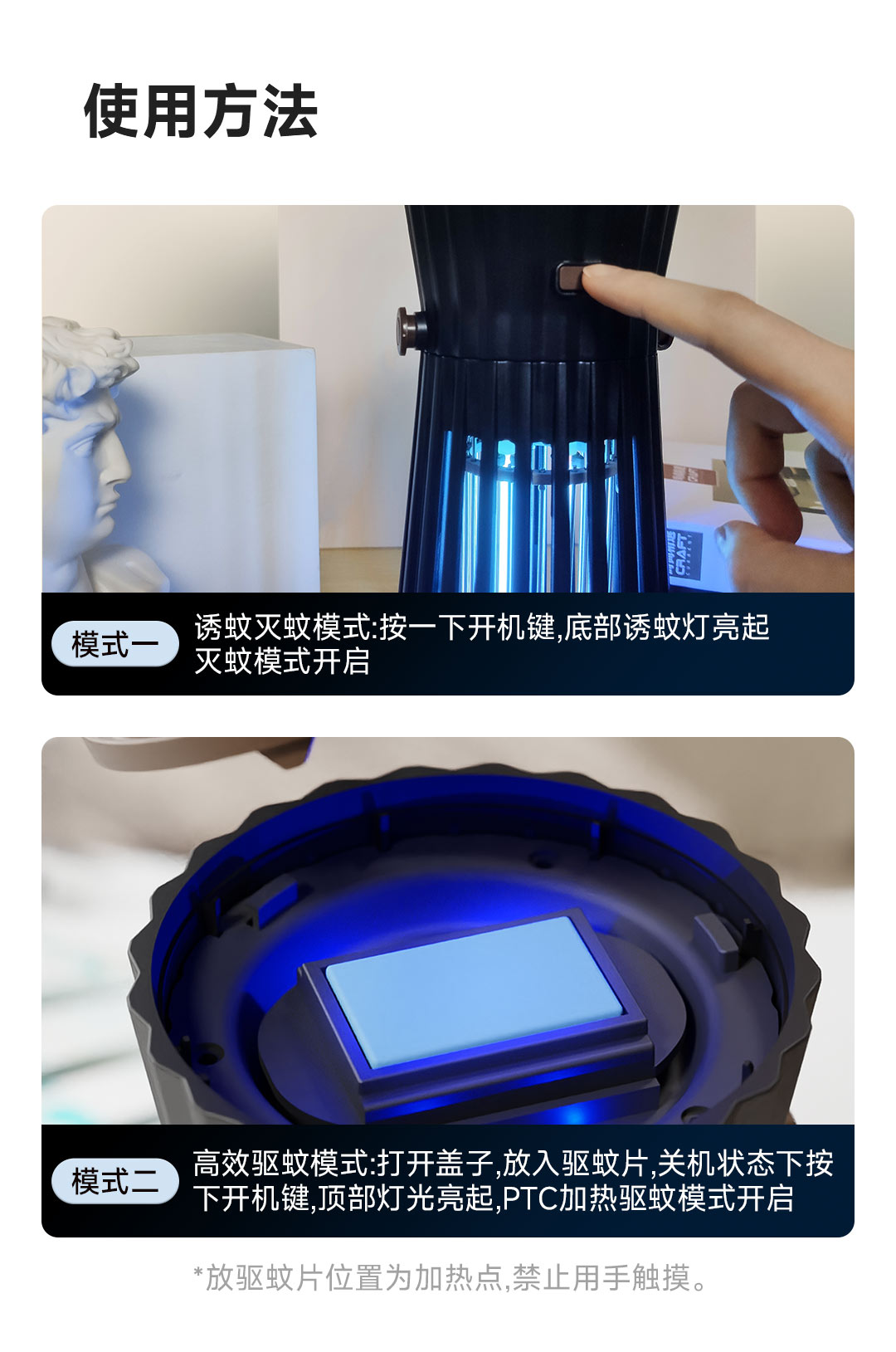 Mở nắp, cho viên thuốc đuổi muỗi vào, bấm nút nguồn, đèn trên cùng sáng và chế độ đuổi muỗi sưởi ấm PTC sẽ bật ( vị trí đặt tấm đuổi muỗi là điểm nóng, không được chạm tay vào )