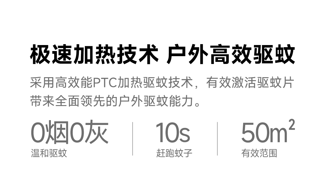 Áp dụng công nghệ đuổi muỗi sưởi ấm PTC hiệu quả cao để kích hoạt hiệu quả các viên thuốc đuổi muỗi, mang lại khả năng đuổi muỗi ngoài trời toàn diện, phạm vi lêm đến 50m2.