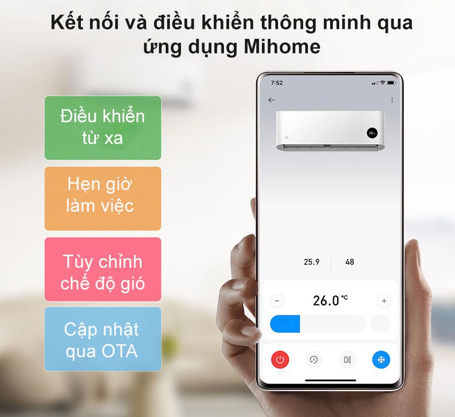 Với ứng dụng Mi Home, bạn có thể điều khiển điều hòa từ xa, bật hoặc tắt, và điều chỉnh các thiết lập khác nhau. Chức năng này còn cho phép bạn thiết lập nhiệt độ theo ý muốn, giúp bạn luôn có thể kiểm soát môi trường sống một cách dễ dàng. Điều hòa còn hỗ trợ cập nhật OTA trực tuyến, mang đến nhiều ứng dụng và tính năng mới trong tương lai.