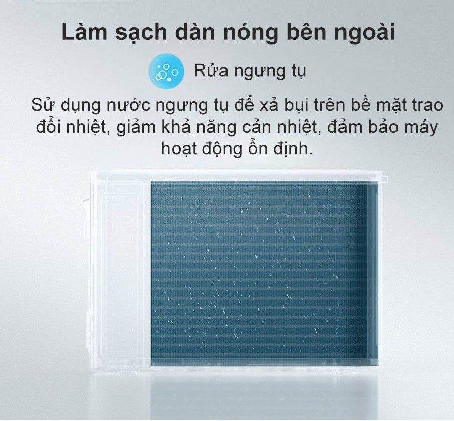 Không chỉ dàn lạnh, dàn nóng của điều hòa cũng được thiết kế tự làm sạch bằng cách sử dụng nước ngưng tụ để rửa sạch bụi bẩn bám trên bề mặt bộ trao đổi nhiệt. Điều này giúp giảm lực cản nhiệt, tăng hiệu suất làm mát và đảm bảo điều hòa hoạt động ổn định hơn.