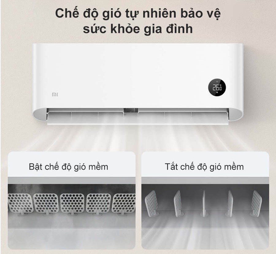 Điều hòa 2 chiều Xiaomi Inverter KFR-35GW/R1X1 với chế độ gió tự nhiên mang đến trải nghiệm gió nhẹ nhàng, mát mẻ. Nhờ có thiết kế 14 cánh quạt điều hướng gió với tổng cộng 602 lỗ tròn nhỏ, chiếc máy lạnh này giúp điều hòa luồng không khí và giải quyết vấn đề gió điều hòa thổi trực tiếp gây lạnh.