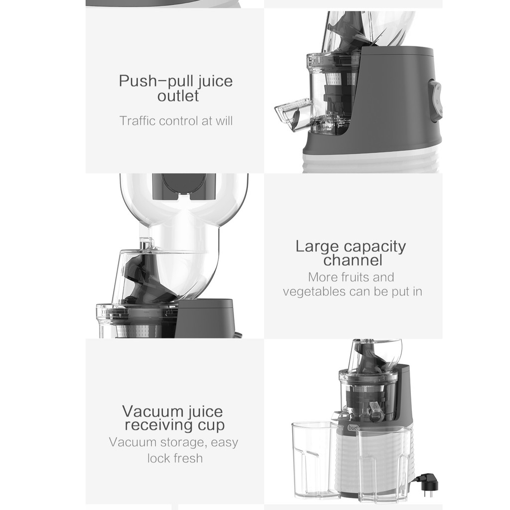 Máy ép Bud có tốc độ làm việc chậm (60 vòng/phút), giúp ép được hầu hết các loại rau củ quả, đồng thời giữ lại các loại vitamin, chất dinh dưỡng cần thiết cho cơ thể và giữ được cả hương vị tự nhiên của hoa quả. Ngoài ra, máy ép hoạt động rất êm ái, không tạo tiếng ồn, giúp bạn có thể làm một bữa sáng đầy đủ dinh dưỡng mà không cần phải lo lắng về việc đánh thức những người thân yêu của bạn.