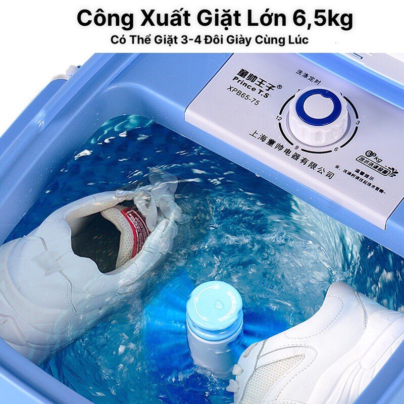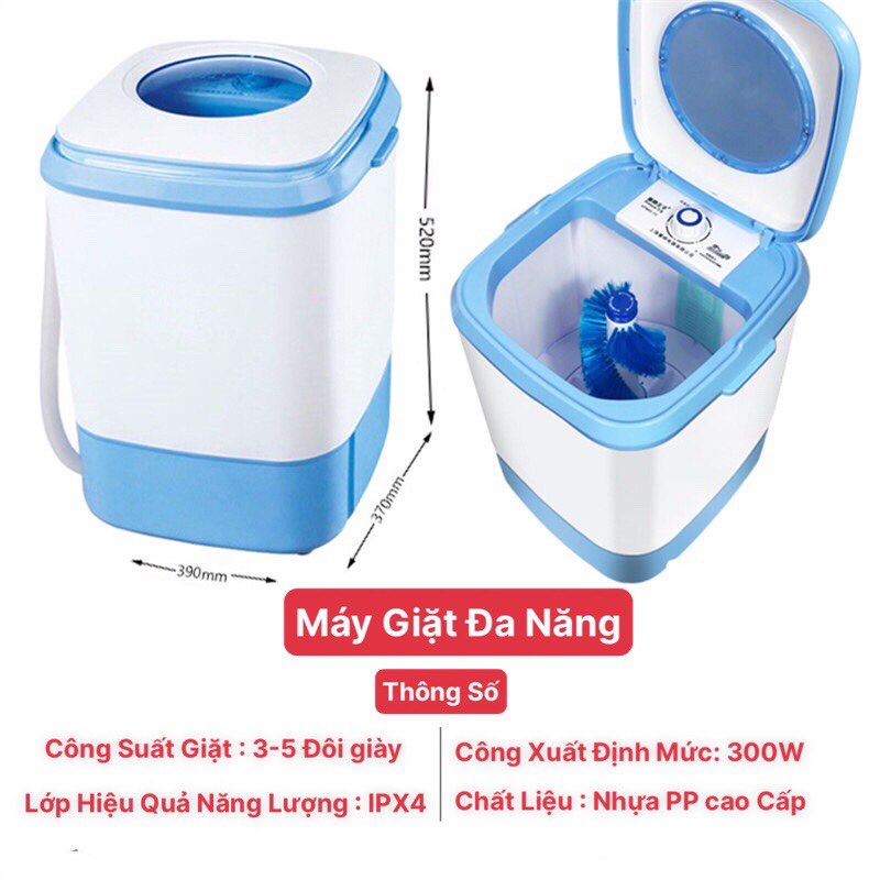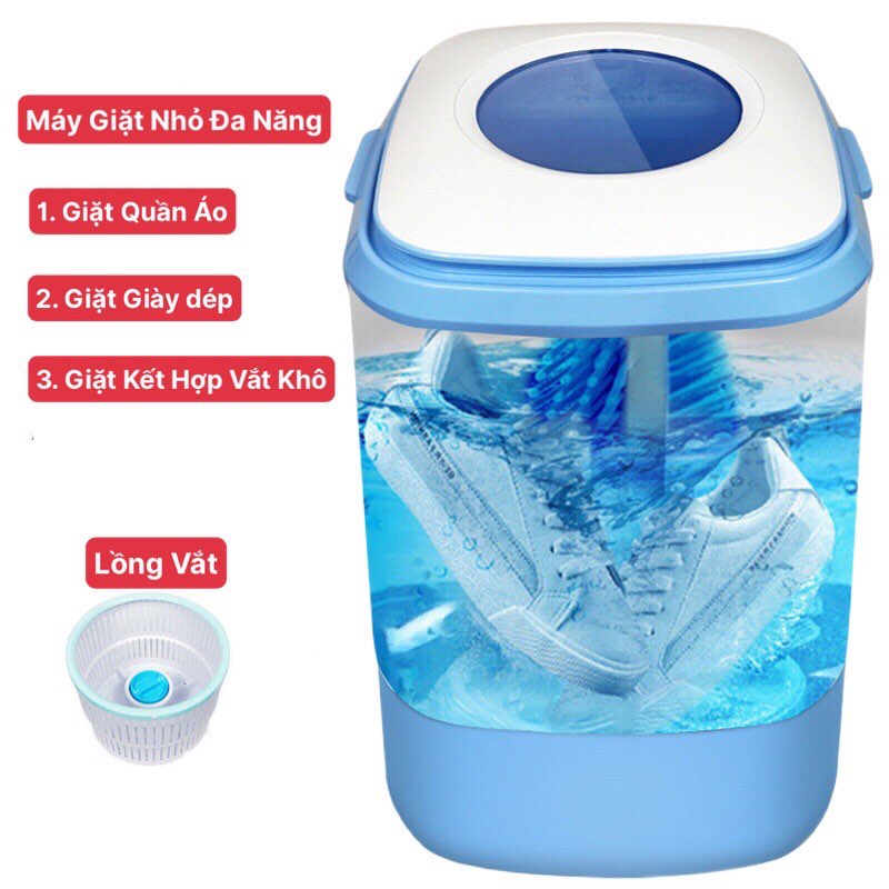 Máy giặt Mini đa năng giặt được cả giày và quần áo, vắt khô, khử khuẩn bằng công nghệ Blue Ag* MÔ TẢ SẢN PHẨM: - Máy giặt có thể giặt được cả quần áo và giầy dép rất tiện lợi, đa năng dễ sử dụng - Gọn nhẹ để trong gia đình, phù hợp với gia đình có trẻ nhỏ - Mô phỏng động tác giặt tay, nước xoáy đánh bật vết bẩn cứng đầu - Sản phẩm phù hợp với: Gia đình có em bé cần giặt riêng đồ của baby rất tiện lợi, người trẻ tuổi độc thân, người già và những nhu cầu cần giặt thường xuyên số lượng đồ không nhiều. - Giặt riêng quần áo lót hay váy áo dễ giãn, nhàu của ba mẹ, đồ người ốm,... đừng kỳ cạch giặt tay hay tống vào giặt chung hết mất vệ sinh lắm mẹ ơi. - Kháng khuẩn bằng công nghệ Blue Ag rất tiện lợi không phải giặt bằng nước sôi. - Vận hành êm ái, gọn nhẹ có thể gấp lại sau khi sử dụng. Dễ dàng vệ sinh lồng giặt. - Hiệu quả cao và di động - Loại bỏ vết bẩn mạnh mẽ - Sạch sẽ vô tận * THÔNG TIN SẢN PHẨM - Chất liệu: Nhựa cao cấp - Màu sắc: Xanh - Điện áp: 220V - Công suất: 153w - Khối lượng giặt 6.5kg - Thời gian hẹn giờ: 0-10p - Kích thước: 55x40x40 - Sản phẩm bao gồm: Máy + lồng vắt + dây sạc