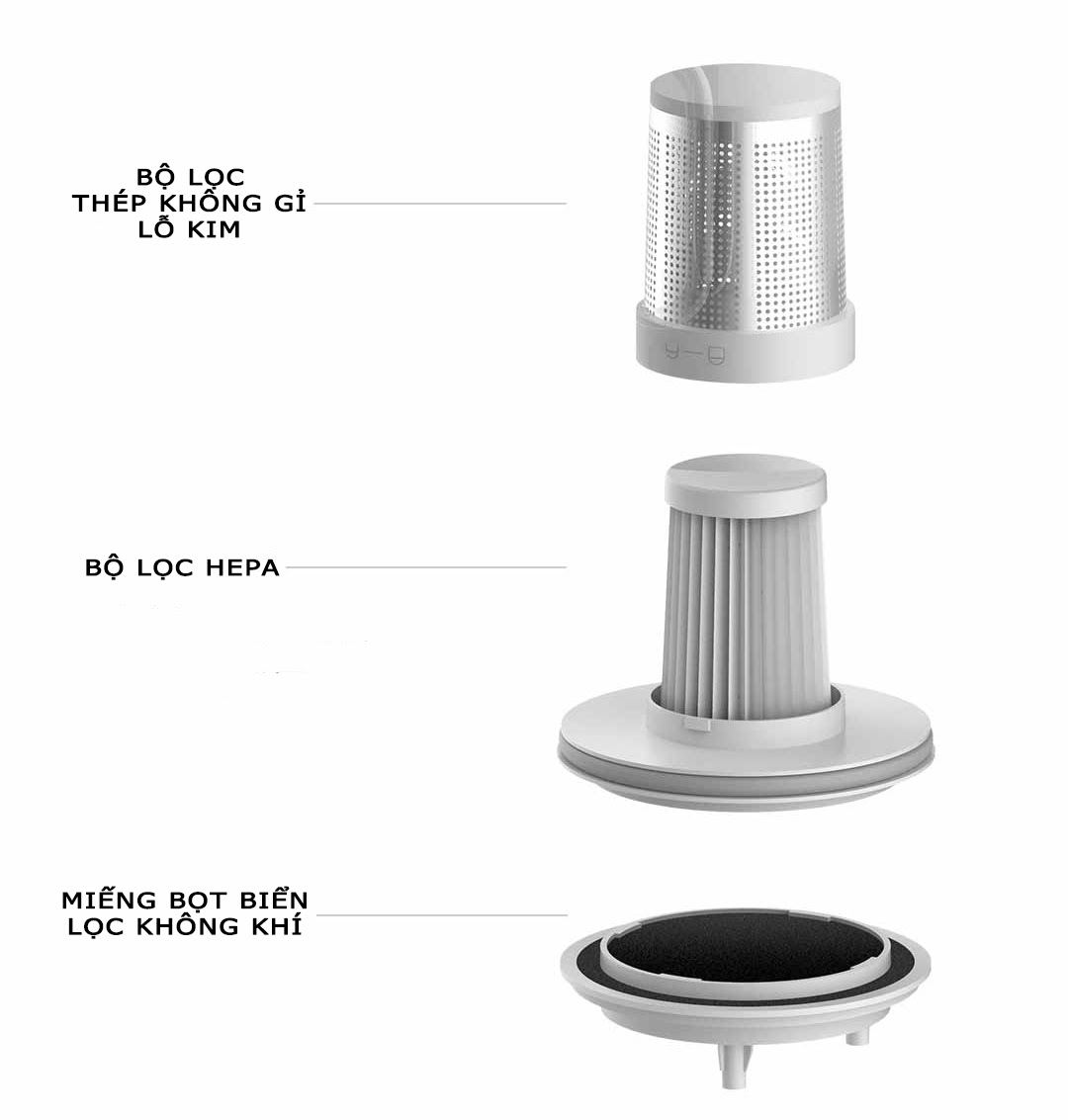 Máy hút bụi diệt khuẩn Mijia được ứng dụng công nghệ tách lốc xoáy tiên tiến cùng 3 bộ lọc cho khả năng hấp phụ hoàn toàn bụi và các chất gây dị ứng. Cụ thể, bộ lọc thép không gỉ lỗ kim giúp ngăn chặn hiệu quả các hạt bụi mịn để tránh làm tắc nghẽn bộ lọc. Tiếp theo là bộ lọc HEPA giúp lọc các hạt bụi nhỏ có kích thước chỉ tầm 0.3µm. Cuối cùng là lớp lọc bọt biển mật độ cao, có khả năng lọc không khí để mang lại không khí sạch và trong lành cho người dùng. Ngoài ra, các bộ lọc này còn có thể được tháo rời dễ dàng và rửa sạch bằng nước thông thường.