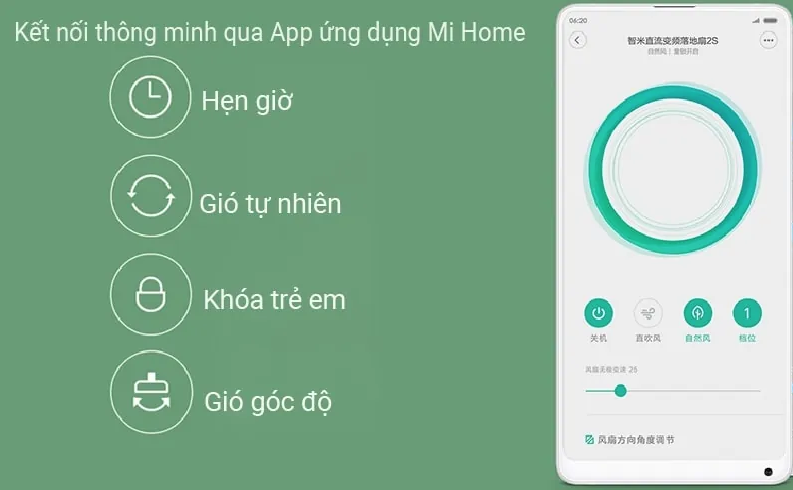 Hỗ trợ kết nối với thiết bị di động thông qua Mihome App, bạn được phép điều chỉnh các chức năng bật/tắt nguồn, điều chỉnh góc xoay, tốc độ gió, hẹn giờ,…điều chỉnh góc gió 30°, 60°, 90°, 120°, chuyển đổi 100 tốc độ gió tùy theo nhu cầu sử dụng… Hỗ trợ Loa xiaomi AI cho phép người dùng điều khiển bằng giọng nói khá tiện lợi.