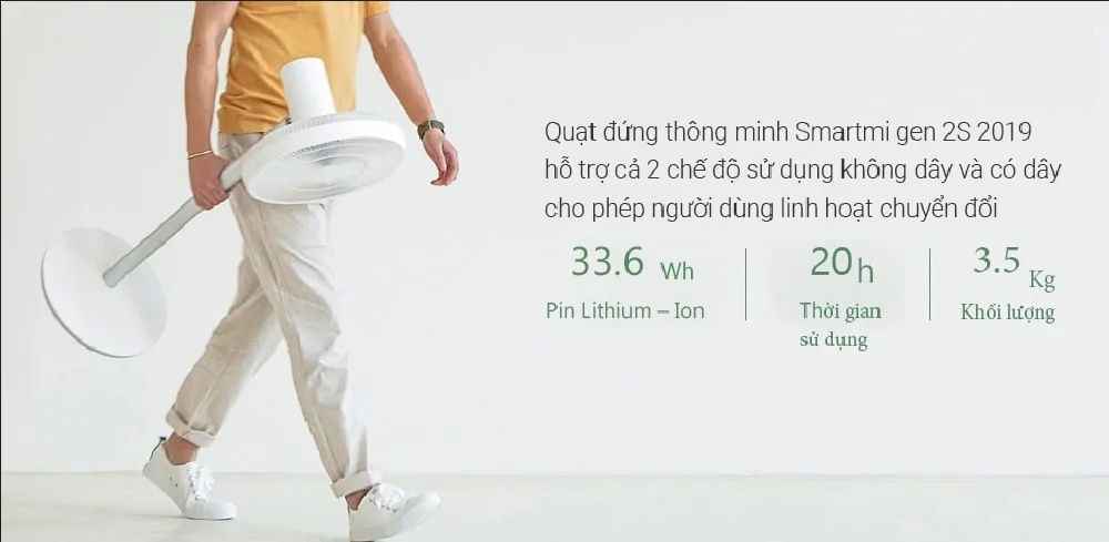 Thay vì sử dụng nguồn điện trực tiếp, Quạt Điện Thông Minh Xiaomi Mi Smart Fan Gen 2S sử dụng bộ pin lithium-ion 33.6Wh được tích hợp được hãng gắn cố dung lượng 2800mAh, có khả năng cung cấp tới 20 giờ hoạt động mà không cần ổ cắm.