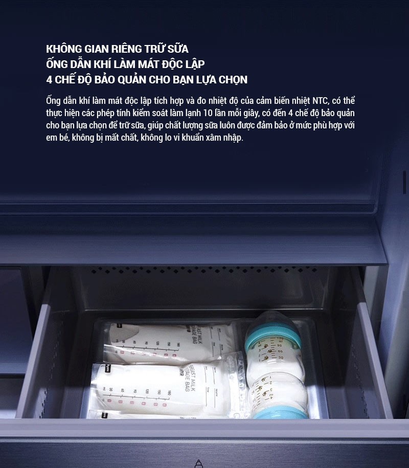 Riêng với khu vực trữ sữa, ống dẫn khí làm mát độc lập tích hợp và đo nhiệt độ của cảm biến nhiệt NTC, có thể thực hiện các phép tính kiểm soát làm lạnh 10 lần mỗi giây, có đến 4 chế độ bảo quản cho bạn lựa chọn để trữ sữa, giúp chất lượng sữa luôn được đảm bảo ở mức phù hợp với em bé, không bị mất chất, không lo vi khuẩn xâm nhập.